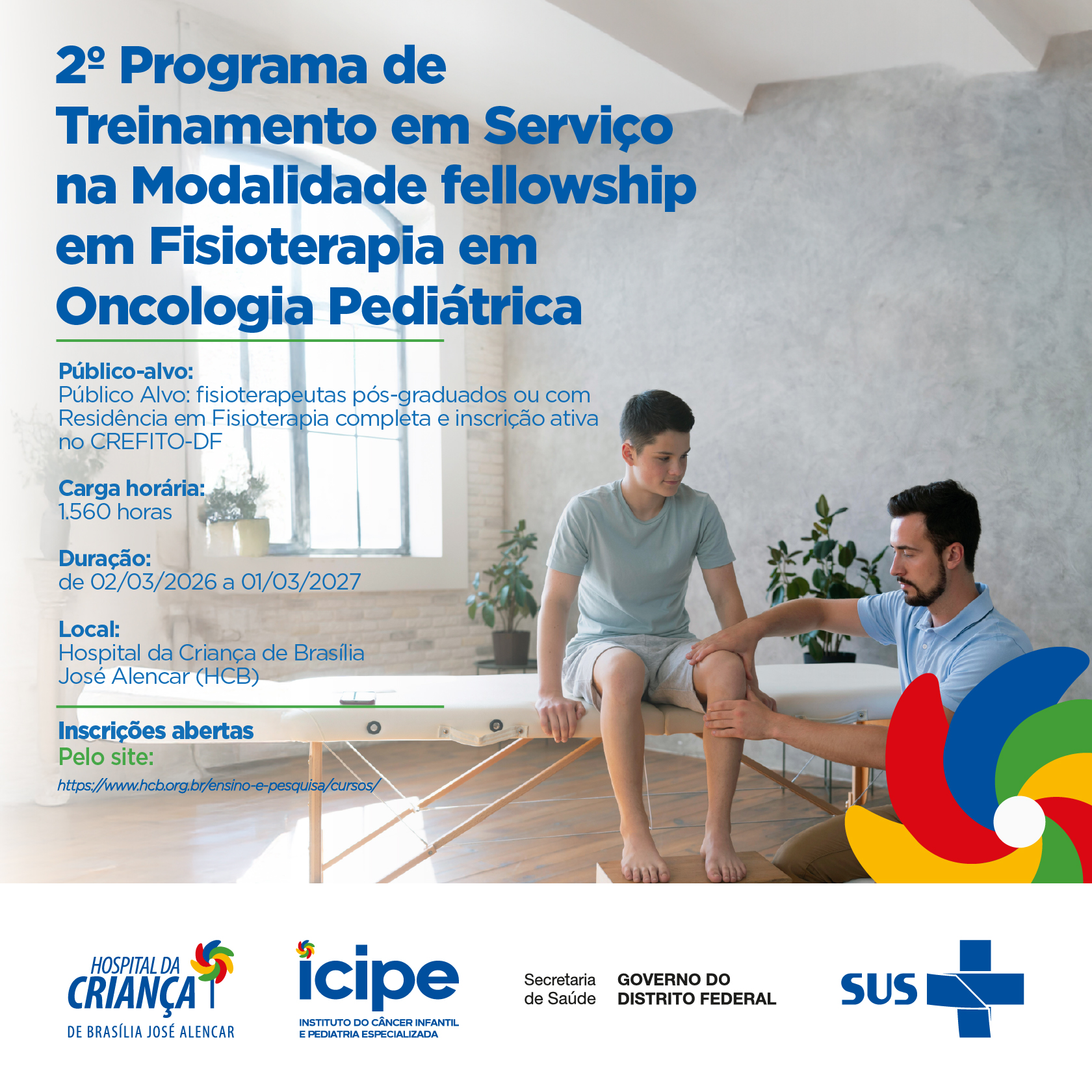 2º Programa de Treinamento em Serviço na modalidade fellowship em Fisioterapia em Oncologia Pediátrica inscrições encerradas 02/03/2026 a 01/03/2027Hospital da Criança de Brasília José Alencar Publicações ARQUIVOS PARA DOWNLOAD Resultado final Resultado da entrevista Resultado análise documental Edital Plano de Trabalho